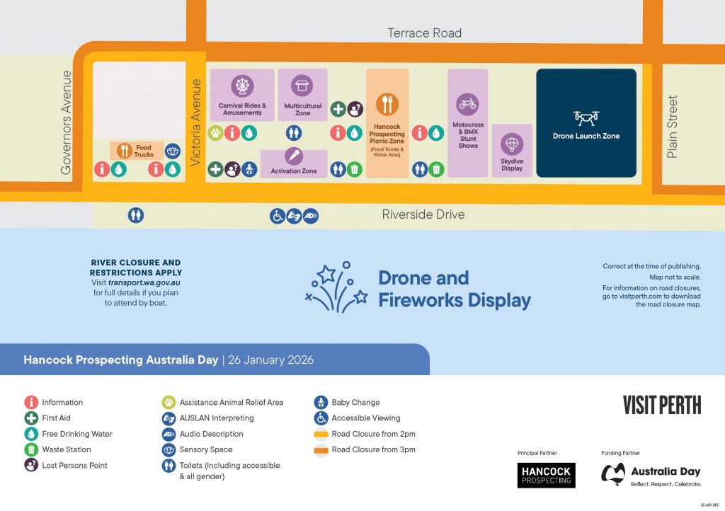 The drone component of the show is not intended to be viewed from locations such as South Perth or Kings Park. Audiences outside Langley Park will miss elements of the full light show experience, including the narrated soundtrack and access to event facilities.