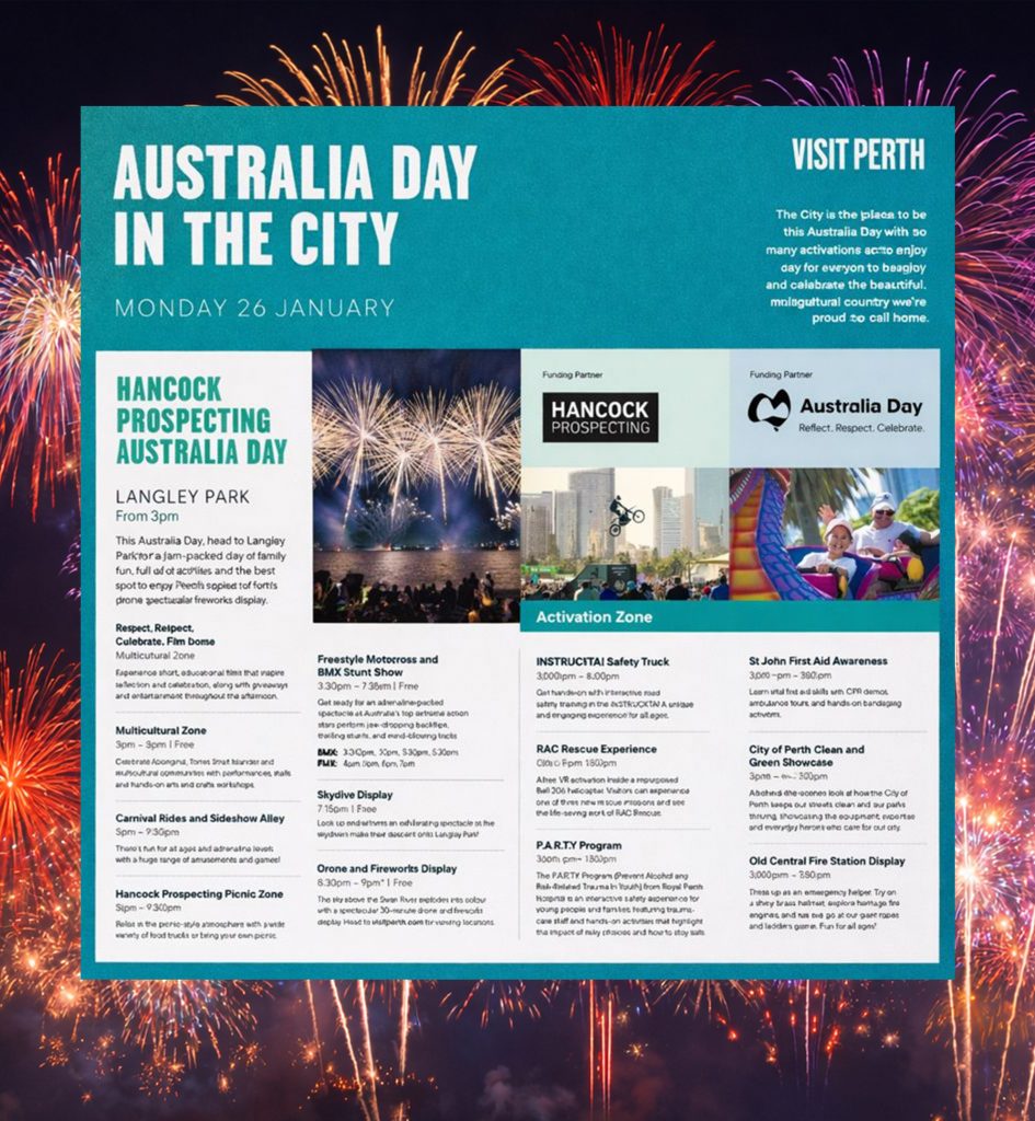 This Australia Day, head to Langley Park for a jam-packed day of family fun, featuring over a kilometre of activities, and the best spot to enjoy Perth’s spectacular drone and fireworks display.