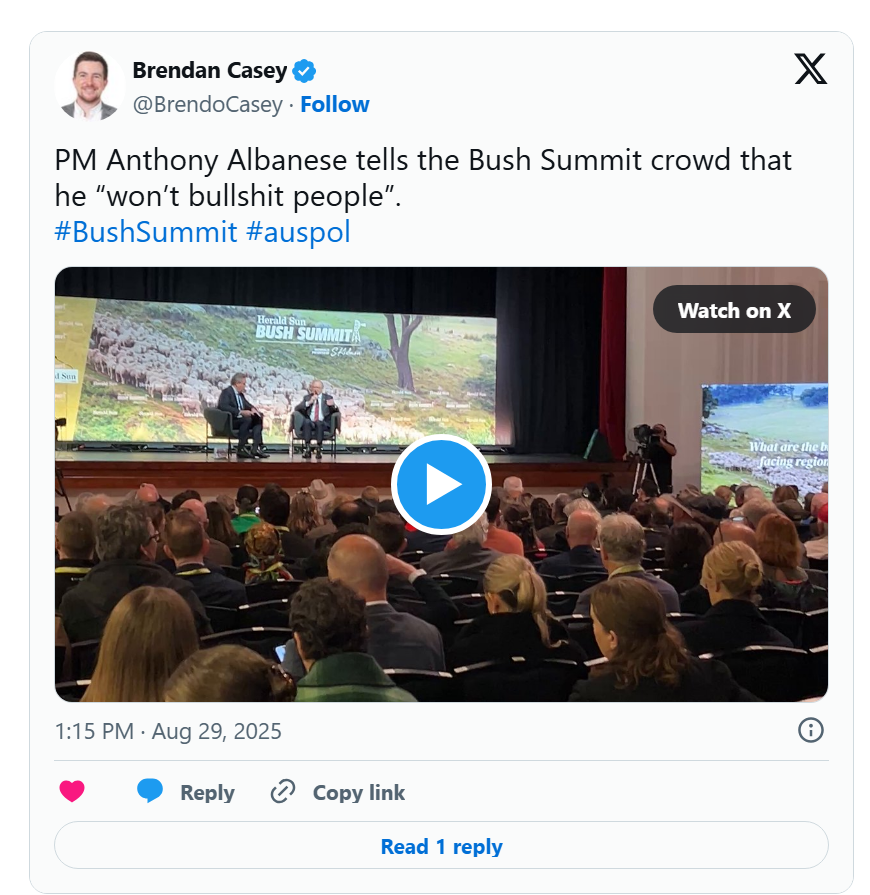 The Premier hasn’t gone out of her way to promote the Bush Summit speech on her social media, but the Prime Minister went into disaster recovery mode, promising $1 billion in support for farmers preparing for drought, whatever that means. It probably doesn’t mean that farmers watching transmission lines cut their paddocks apart, or their hillsides littered with skyscraper-sized wind turbines, receive compensation.