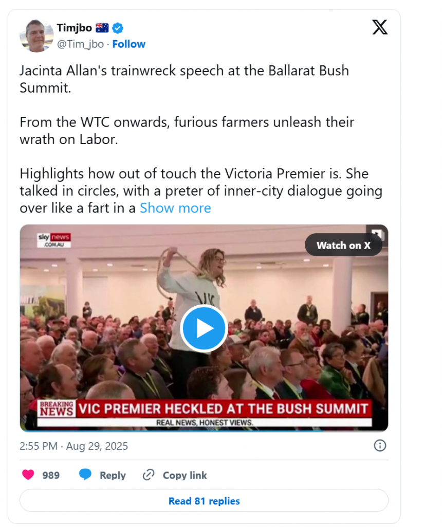 Her mentions of ‘listening’ and ‘respect’ were met with … exactly what you’d expect by a community being taxed and abused by a government obsessed with pleasing its inner-city seats with Net Zero.