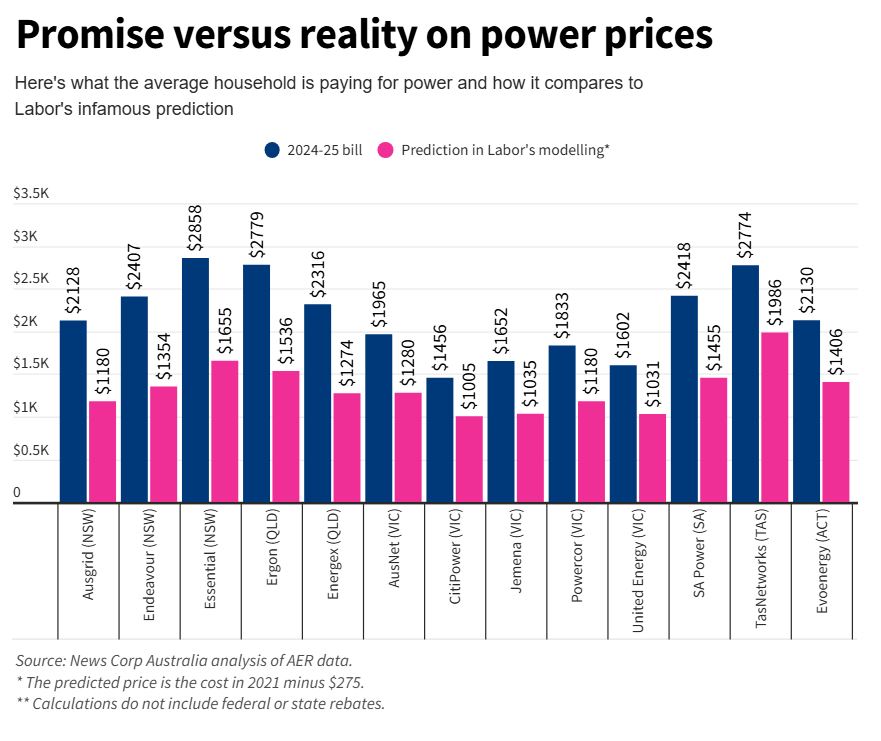 EXCLUSIVE: The full scale of federal Labor’s epic fail on power prices can be revealed for the first time, with average households in vast parts of the state now paying $1200 a year more than Anthony Albanese and Chris Bowen promised.