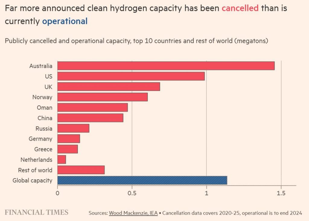 The projects that have been cancelled or paused had a combined annual output of 4.9mn tonnes, according to data from S&P Global, equivalent to more than four times the world’s installed clean hydrogen capacity.