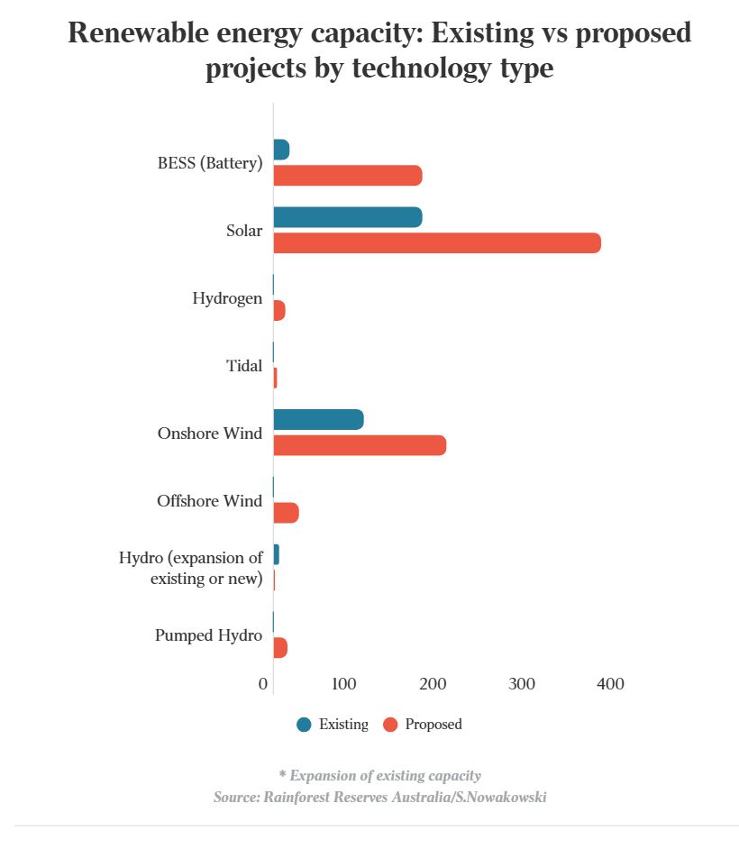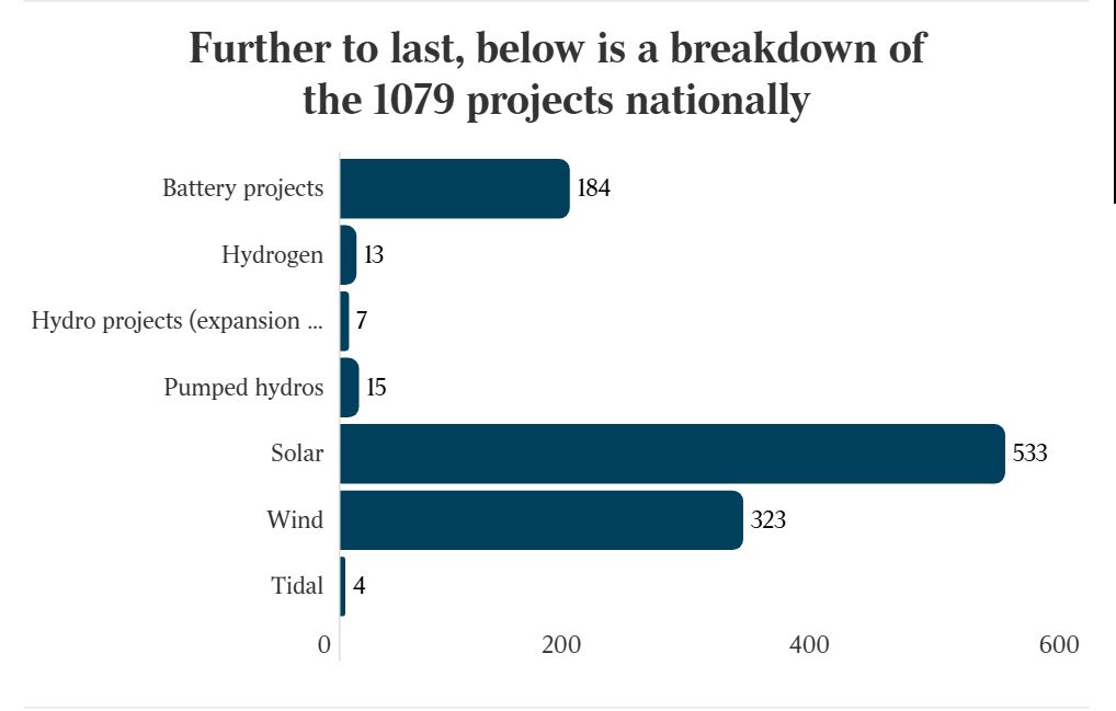 The 1079 projects include 533 solar schemes (including 367 proposed), 323 wind farms (222 proposed), 184 battery (166 proposed), 15 pumped hydro (all proposed), 13 hydrogen (all proposed), seven hydro (all proposed or expansions) and four tidal (all proposed).