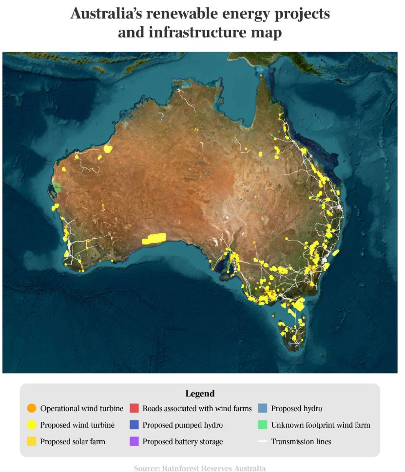 The figures – Australians’ first comprehensive glimpse of the true scale of the renewables revolution – have been compiled by conservationists and communities pushing for a better-planned rollout.
