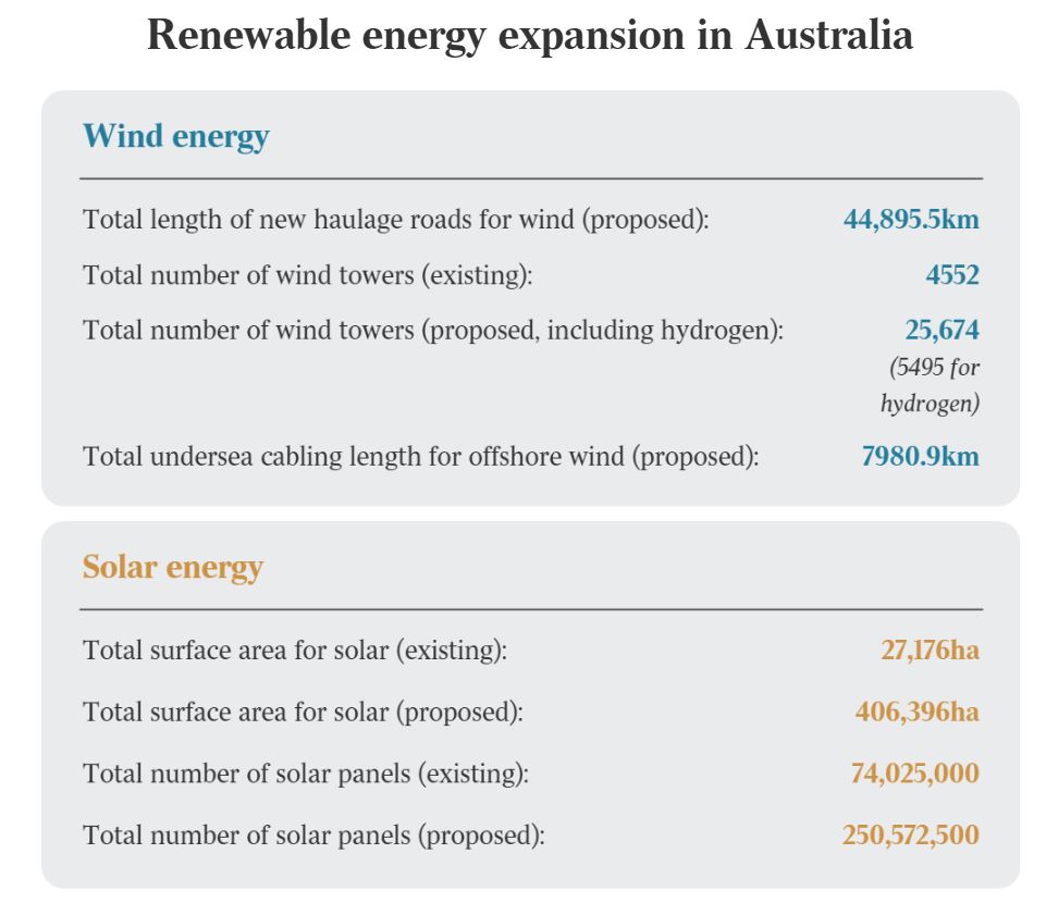 The stunning scale of Australia’s renewables rollout can be revealed: 1000 projects costing $1.33 trillion, including 25,000 more wind towers with 45,000km of associated roads, and 250 million solar panels on 406,000ha.