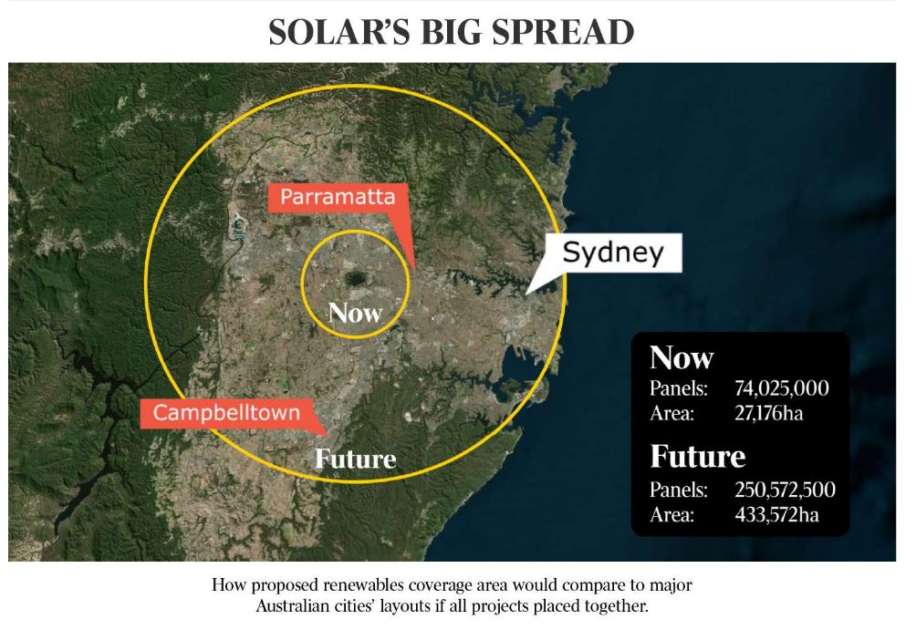 But such is the increase in solar, it expands the area they take up from 27,176ha to 433,572ha, effectively equivalent to almost all of metropolitan Sydney, parts of the lower Blue Mountains and beyond Richmond and Campbelltown.