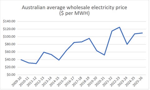 Average electricity wholesale prices rose from less than $40 per MWh in 2009 (actually less than $30 in 2011) to their present $110.