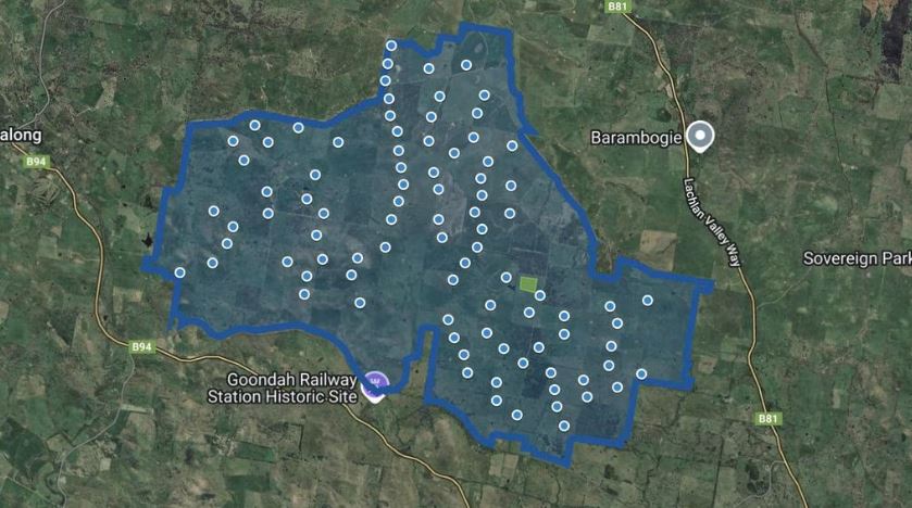 The map from Wind Prospect showing 90 proposed wind turbines, each measuring 260m tall, between Bowning and Binalong. Picture: Supplied